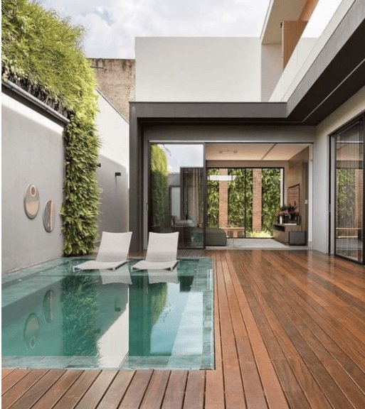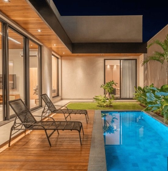 Decking menambah kesan hangat, natural, dan eksklusif di sekitar kolam.